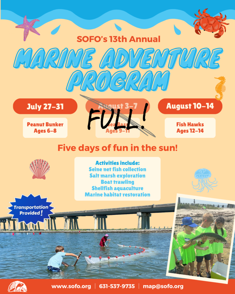 The Marine Adventure Programs consist of five days of adventure exploring marine and freshwater habitats and the ecology of their fascinating inhabitants. Your child will come away with a new appreciation for our diverse environments here on the East End of Long Island’s South Fork.
